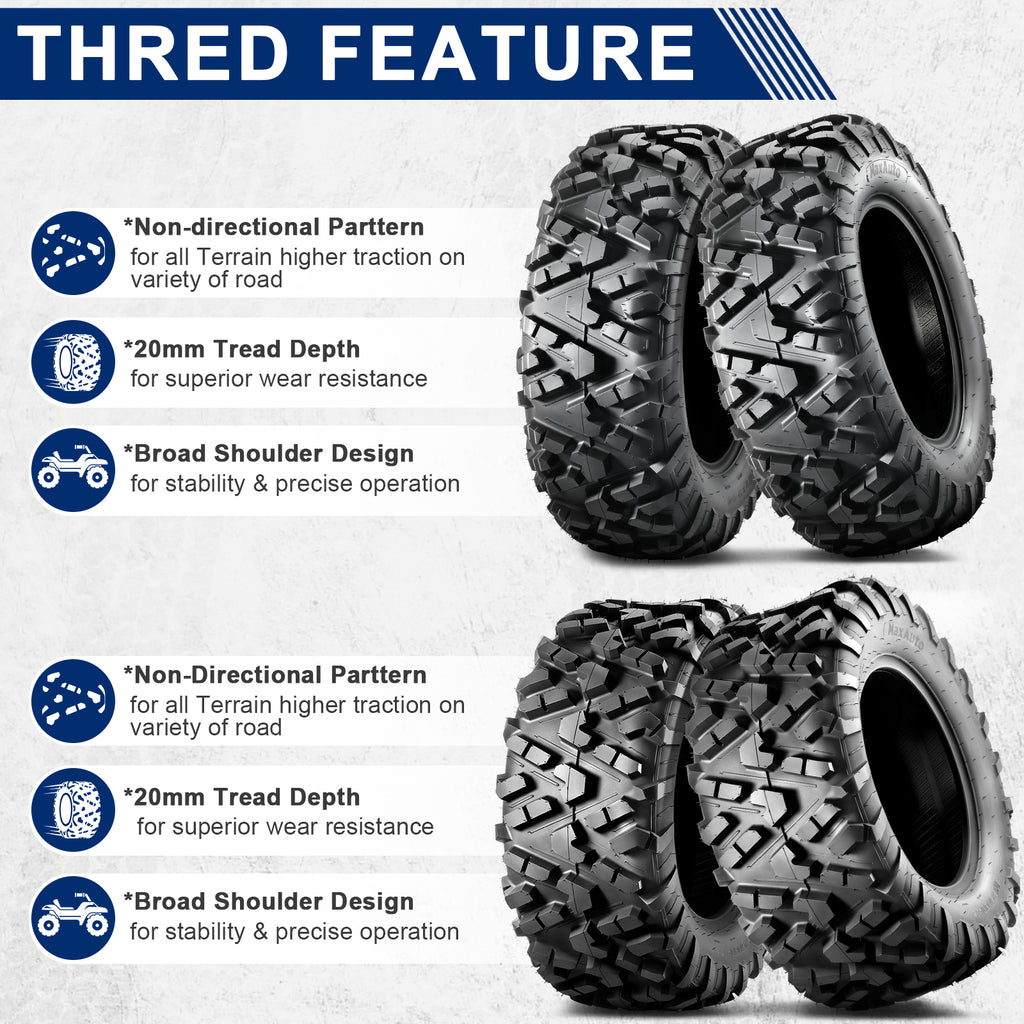 The 27-inch ATV tires feature a non-directional A-shaped tread pattern designed for optimal control across all terrains. They deliver exceptional performance on trails, deserts, mud, dirt, sand, hard rock, GNCC courses, and even snow.